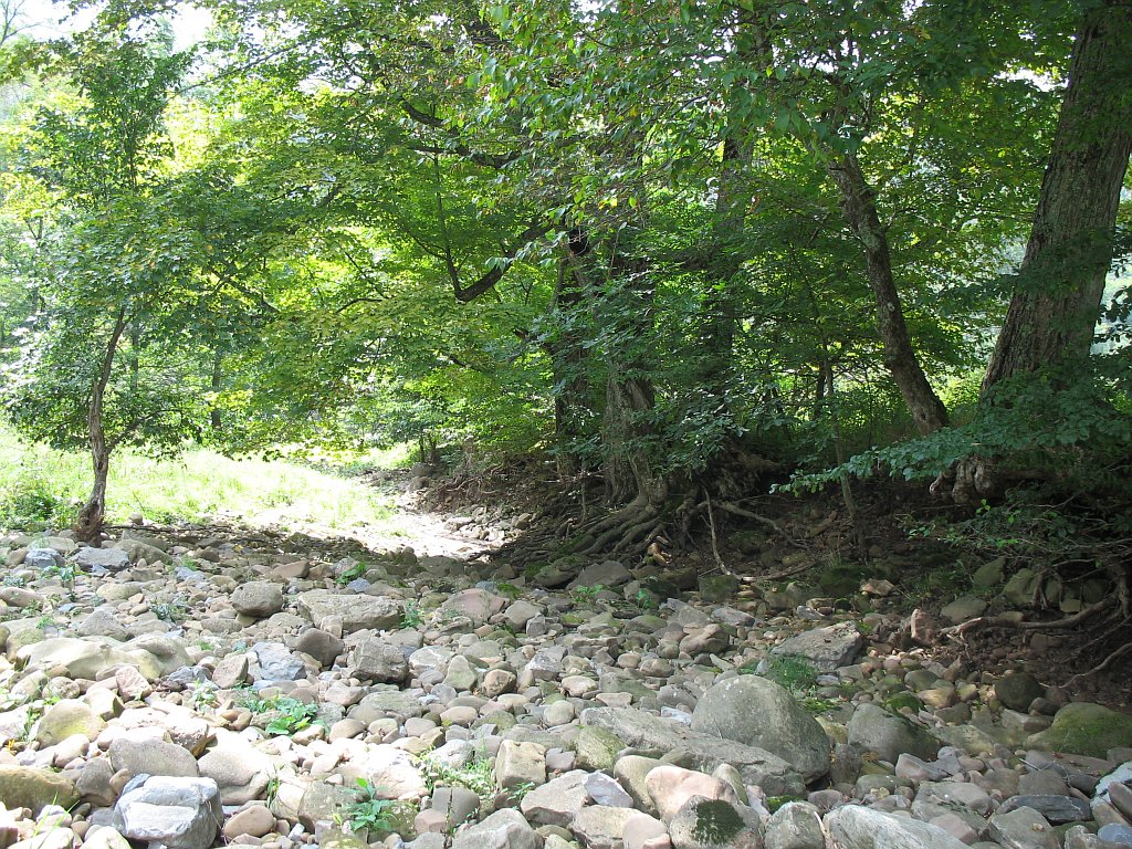 The innumerable stones of Big Spring Fork are today laced and bordered with an increasing decor of fallen leaves. Their browns and turning greens complement the grey stones. With summer's flowers now gone and the cool telling breeze signaling the soul, today is more fall than summer. Inside we know this, that we concur with the crickets.