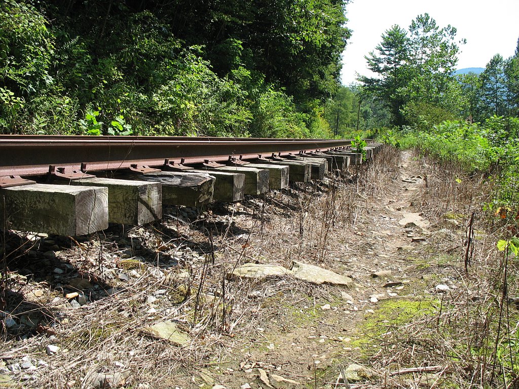 Not far into the walk, the effects of time, water, and weather are clearly evident. In places, the rail ties are underwashed and intrude shadowy upon the worn footpath of fishers, hikers, and wildlife.