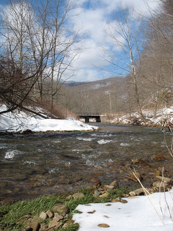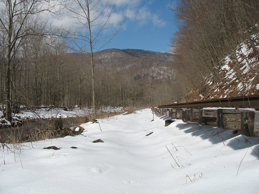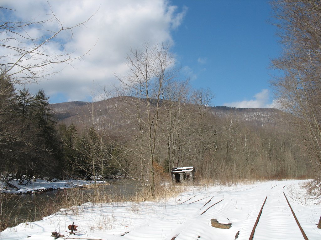 The view from the vicinity of these pilings is today extraordinary. I make my way down the bank of the Big Spring Fork and onto an exposed grassy isle just in the court of the pilings. Looking north-west back the way I had trod, I see Gauley Mountain, still hoarfrosted, communing with the sky so blue and cottoned. A rail bridge, disfunctional but standing, was once companion to the locomotive turning process. It spans the Big Spring Fork where the fork merges, and to me it seems that Gauley Mountain is admiring the bridge's form as am I.