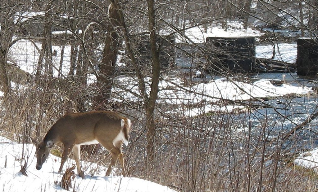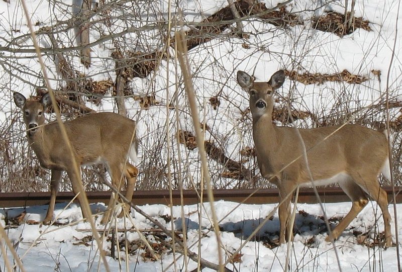 I decide to about-face and walk up the track of the Big Spring Fork for a bit. As I stop to take some pictures, I realize that I have been photographed in the minds of two young deer foraging along the abandoned rail line. They look fine and healthy, and evidently don't feel an escape effort is warranted on my account. Through their frequent and casual gazes, they convey their tolerance of me and their need to conserve some hard-earned winter energy. I go about taking some pictures, and they go on scraping through the snow for whatever will work.