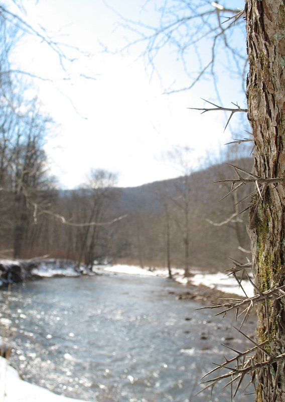 Walking about is a labored task. The snow is a foot deep or so, and each step sends my boot breaching through the glazed snowy top down deeply. Up, out, and down again. Step by step, crunch-puff, crunch-puff, I rudely impose my sounds upon the audioscape of happy water and frosted valley breath.