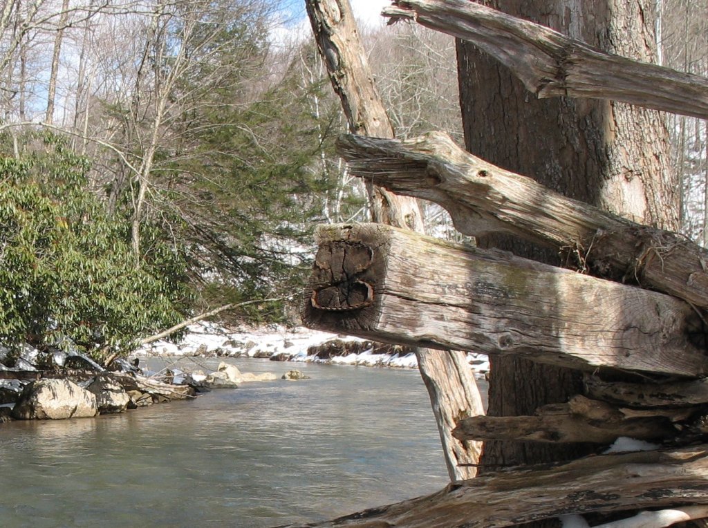 Skipping across this span of the Big Spring Fork is a series of concrete pilings. They number 8 shore-to-shore, but for a long time have not held their run of rails that once allowed locomotives to turn around here, where Slatyfork proper once thrived. Instead, now they pass the time toying with defeated trees that think they've got what it takes to float past them. They seem fine, really, patient and content, harking back for our sake so that we might not forget them and the weight and pleasure of history they have borne.