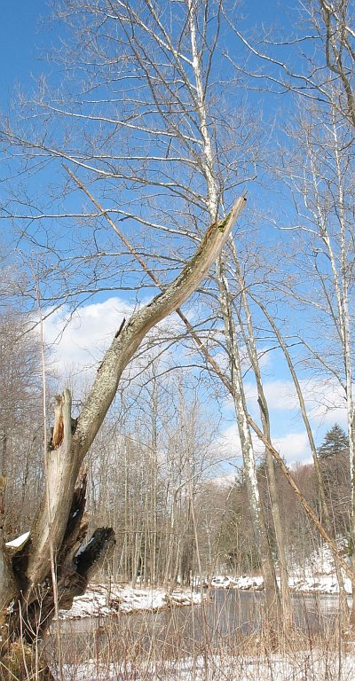 I am now at the close of this stretch of magic woods, standing upon a snowy dry-stalked opening. I stare downriver, through and beyond the last few residents of this patch, and cast my thoughts and wishes into the Elk which curves and flows on.