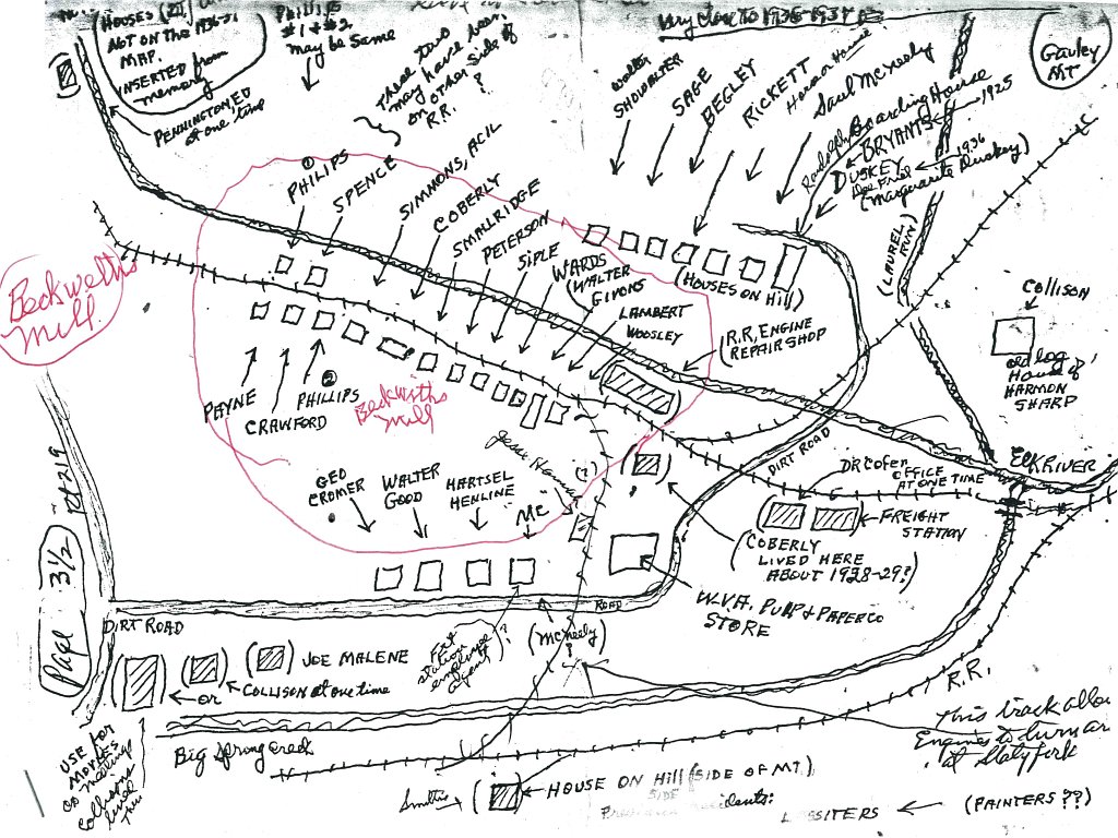 Dave Sharp drew this area map of things our time might not quite recall. Can you spot Harmon's log house (built by his father William III)?
